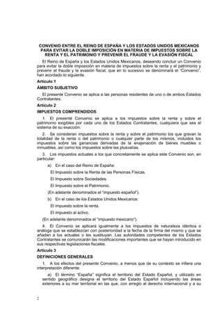 Este documento es el instrumento de ratificación del convenio entre España y México para evitar la doble imposición en materia de impuestos sobre la renta y el patrimonio. El rey Juan Carlos I de España aprueba y ratifica el convenio firmado entre los dos países, que consta de 29 artículos, para evitar la doble imposición y prevenir el fraude fiscal. El convenio se aplica a los impuestos sobre la renta y el patrimonio de ambos países.