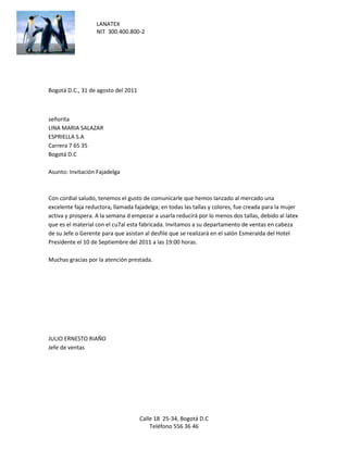 La empresa LANATEX invita a los jefes de ventas y gerentes de las empresas SANCHEZ LIDA, ESPRIELLA S.A. y CUERO IN MODA a asistir a un desfile el 10 de septiembre de 2011 a las 19:00 horas en el Hotel Presidente para presentar su nueva faja reductora llamada Fajadelga, fabricada en látex, que promete reducir dos tallas a la semana.