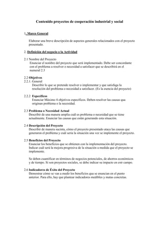 El documento presenta un formato estándar para la presentación de proyectos de cooperación industrial y social como parte de obligaciones de offset de empresas extranjeras que venden equipos de defensa al gobierno colombiano. El formato incluye secciones para describir el marco general, objetivos, necesidad a resolver, beneficios, estudio de mercado, aspectos técnicos, cronograma, inversiones y sostenibilidad financiera del proyecto.
