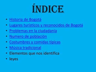 Este documento resume información sobre Bogotá, incluyendo su historia, lugares turísticos, problemas sociales, población, costumbres, música tradicional e identidad cultural. Fue fundada en 1538 por Gonzalo Jiménez de Quesada y actualmente tiene una población estimada de 7.3 millones de habitantes.
