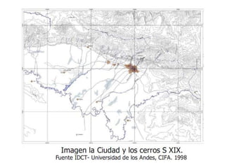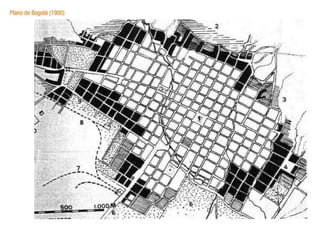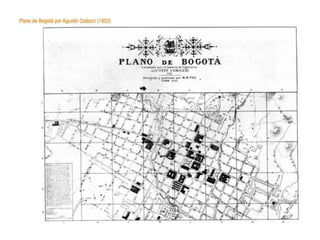 Este documento presenta una serie de mapas y gráficos que muestran la evolución urbana de Bogotá desde 1539 hasta 2010, destacando el crecimiento del área y densidad poblacional a lo largo de los siglos, así como las tasas de incorporación de nuevas áreas a la ciudad cada década desde 1912.