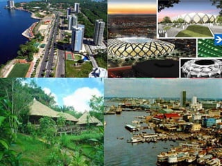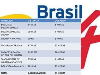 Este documento describe un viaje en ruta de Bogotá, Colombia a Manaos, Brasil pasando por Venezuela. Detalla las ciudades que se visitarán en cada día del viaje, incluyendo San Antonio, San Cristóbal y Barinas en Venezuela, y Caracas, la capital. También incluye información sobre el precio de la gasolina, los kilómetros recorridos en cada país, los costos estimados de alimentación, eventualidades y estadía, y los tipos de cambio entre dólares y pesos colombianos.