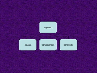 El bogotazo fue una revuelta popular en Bogotá tras el asesinato de Jorge Eliécer Gaitán el 9 de abril de 1948. La gente reaccionó violentamente debido a las ilusiones y esperanzas que Gaitán había sembrado en sus mentes.