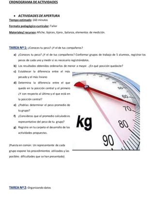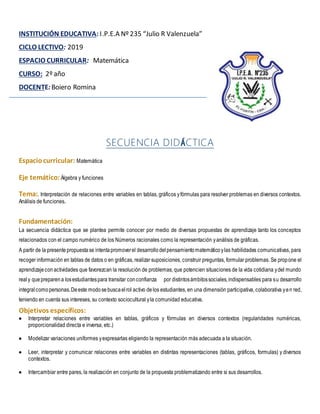 Este documento presenta una secuencia didáctica sobre álgebra y funciones para el curso 2o año. La secuencia incluye actividades para interpretar relaciones entre variables en tablas, gráficos y fórmulas, y analizar funciones. Las actividades se centran en recolectar y analizar datos sobre el peso de los estudiantes para identificar regularidades y calcular promedios. El objetivo es promover el pensamiento matemático y habilidades comunicativas a través de la resolución colaborativa de problemas basados en la vida real.