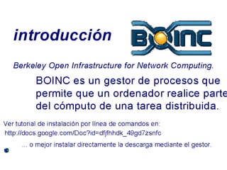 Este documento presenta la computación distribuida y el proyecto Rosetta@home. Explica cómo instalar el software BOINC y unirse al proyecto Rosetta para ayudar a investigar proteínas y enfermedades mediante el uso del computador cuando no está en uso. También compara la capacidad de cómputo de Rosetta@home con un supercomputador.