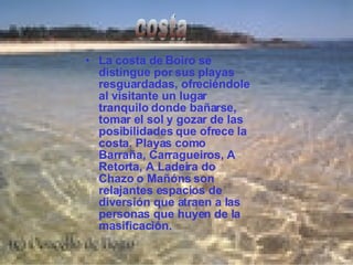 El documento describe la ubicación y características geográficas del municipio de Boiro en la provincia de A Coruña, Galicia. Boiro se encuentra en la costa sur de la sierra del Barbanza, con una franja costera que da al mar de Arousa. La costa de Boiro se distingue por sus playas tranquilas como Barraña, Carragueiros y A Retorta. El municipio limita con Rianxo, Lousame, Porto do Son y Pobra do Caramiñal.