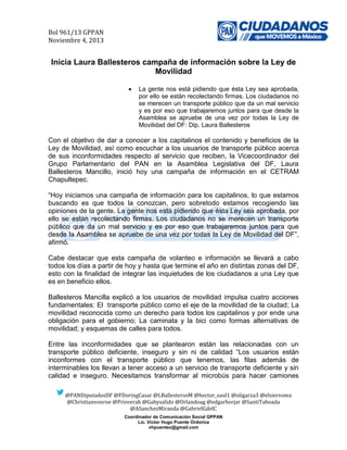La diputada Laura Ballesteros inició una campaña de información sobre la Ley de Movilidad en el DF para dar a conocer sus beneficios y escuchar las inquietudes de los usuarios del transporte público. Los ciudadanos están pidiendo la aprobación de esta ley para mejorar el deficiente y poco seguro servicio de transporte. La campaña recopilará firmas y opiniones para integrarlas a una ley que mejore la movilidad en beneficio de los capitalinos.