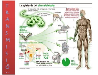 Este documento proporciona información sobre el virus del Ébola, incluyendo sus características, transmisión, síntomas, diagnóstico y tratamiento. El virus del Ébola causa una enfermedad grave conocida como fiebre hemorrágica del Ébola y se transmite a través del contacto directo con sangre u otros fluidos corporales de personas infectadas. Los síntomas incluyen fiebre, debilidad severa, dolor de cabeza y de garganta, y puede conducir a hemorragias internas y externas. No existe una