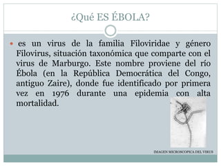 El documento describe el virus del Ébola, incluyendo que es un filovirus identificado por primera vez en 1976 en la República Democrática del Congo, causa fiebre alta, dolores musculares y hemorragias internas con una alta tasa de mortalidad del 90%, y afecta a países del África occidental como Guinea, Sierra Leona y Liberia. No tiene cura específica, el tratamiento es de soporte y aislamiento del paciente.