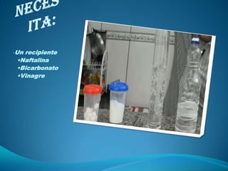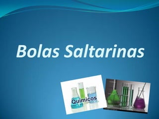 El documento describe cómo hacer bolas saltarinas usando naftalina, bicarbonato y vinagre. Se pone naftalina en un recipiente con agua y vinagre. Luego se agrega bicarbonato, lo que causa una reacción química que forma burbujas de dióxido de carbono que hacen que las bolas de naftalina floten arriba y abajo en el agua.