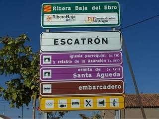 El documento es una canción llamada "Bolero de Escatrón" que describe la vida y paisajes del pueblo de Escatrón en Aragón, España. La canción habla de pasear por los campos de olivos y calles de piedra del pueblo, así como de ir al embarcadero junto al río Ebro. También menciona lugares como la ermita, la iglesia y la plaza principal, y celebra a los patrones del pueblo, Santa Águeda y San Roque. En general, el bolero transmite las costumbres