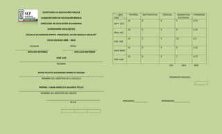 Este documento presenta los resultados académicos de un estudiante llamado José Luis Aguilar Pérez en la Escuela Secundaria Prof. Francisco Javier Badillo Aguilar durante el ciclo escolar 2009-2010, mostrando sus calificaciones promedio en diferentes asignaturas y periodos.