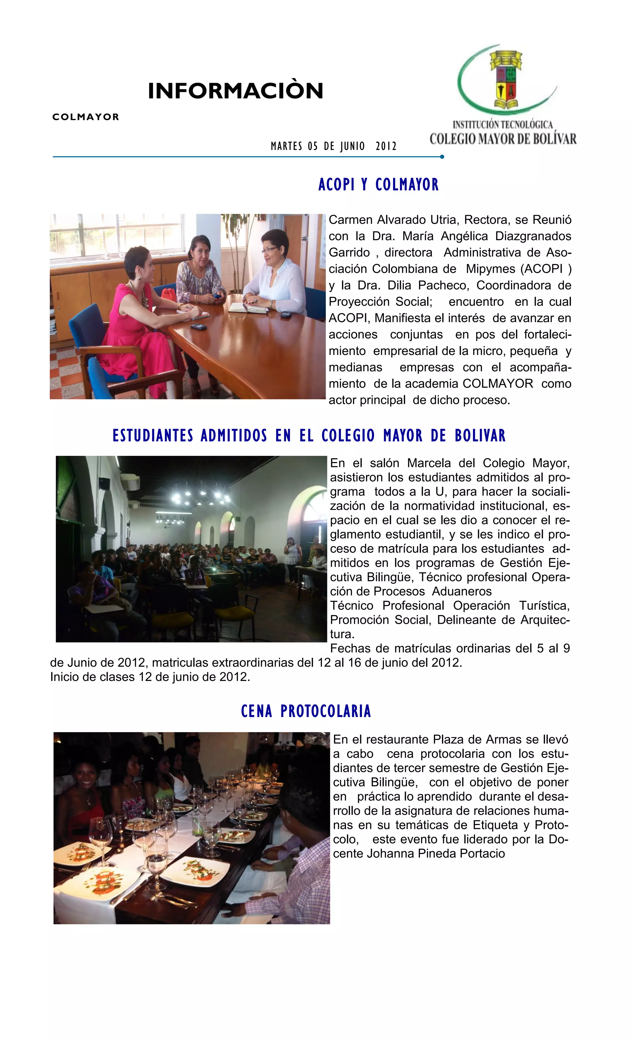 El Colegio Mayor de Bolívar se reunió con ACOPI para explorar oportunidades de colaboración en el fortalecimiento de pequeñas y medianas empresas. Adicionalmente, se informó a los estudiantes admitidos sobre el proceso de matrícula e inicio de clases en diversos programas. Finalmente, se llevó a cabo una cena protocolaria con estudiantes de Gestión Ejecutiva Bilingüe para aplicar conocimientos de etiqueta y protocolo.