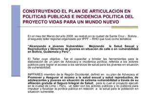 El documento describe los esfuerzos del proyecto Vidas para un Mundo Nuevo para mejorar el acceso a los servicios de salud de los adolescentes y jóvenes en situación vulnerable en la región de Callao, Perú. Estos incluyen 1) identificar a la población vulnerable a través de dirigentes vecinales, 2) coordinar con actores políticos clave como el Seguro Integral de Salud, y 3) implementar un plan piloto de aseguramiento casa por casa que benefició a 191 personas.