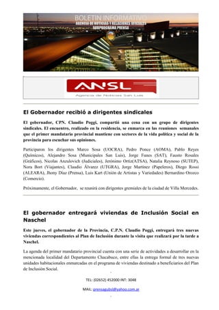El Gobernador se reunió con dirigentes sindicales en la residencia para escuchar sus opiniones. Participaron dirigentes de diferentes sindicatos. Próximamente el Gobernador se reunirá con dirigentes gremiales de Villa Mercedes.