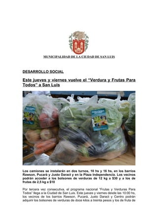 1) Se llevará a cabo un programa de ferias móviles de verduras y frutas a precios accesibles en diferentes barrios de la ciudad los días jueves y viernes.