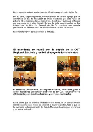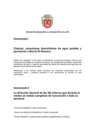 La Municipalidad de la Ciudad de San Luis anuncia obras de cloacas, agua y pavimento en el Barrio El Hornero y vacunaciones del personal de Ser Ba. También, el Intendente se reunió con líderes sindicales quienes expresaron su apoyo al proyecto municipal. Finalmente, se detallan diversos talleres culturales, deportivos y de capacitación que ofrece la municipalidad.