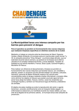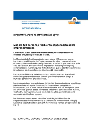 La Municipalidad de San Luis ofreció capacitaciones a más de 130 personas inscritas en el Registro de Emprendedores Sociales sobre temas como posicionamiento empresarial, marketing y comercialización para obtener créditos y financiamiento para nuevos emprendimientos. También lanzó la campaña "Chau Dengue" para prevenir la enfermedad mediante limpiezas en distintos barrios y concientización a vecinos. Otras actividades incluyeron charlas sobre prevención del cáncer de mama y reuniones con instituciones para encarar pro