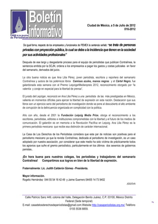 La Suprema Corte de Justicia de la Nación negó un amparo a empresas contratistas de PEMEX que demandaron a la revista Contralínea por daño moral, apoyando así la libertad de expresión. Además, la periodista Ana Lilia Pérez de Contralínea recibió el Premio Leipziger Medienpreis 2012 por su valentía en la defensa de la libertad de prensa. La Casa de los Derechos de Periodistas celebró estas victorias para el periodismo mexicano.
