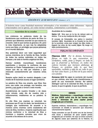 El boletín de la iglesia informa a los miembros sobre temas relacionados con la iglesia e incluye estudios bíblicos. Se recuerda a los cristianos que Dios los ama, los cuida y los adoptó como sus hijos. Se anuncian próximos eventos como una convivencia y estudios de evangelización. También se incluyen oraciones, cumpleaños, himnos y detalles de contacto de la iglesia.