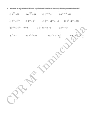 Este boletín presenta varios problemas relacionados con logaritmos y ecuaciones exponenciales. En la primera sección, se pide calcular valores de logaritmos aplicando la definición. La segunda sección trata sobre expresar logaritmos utilizando propiedades. La tercera sección pide desarrollar expresiones logarítmica. La cuarta sección contiene ecuaciones logarítmicas que deben resolverse. Finalmente, la quinta sección presenta sistemas de ecuaciones logarítmicas para resolver.