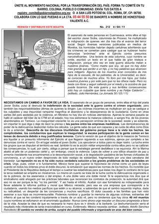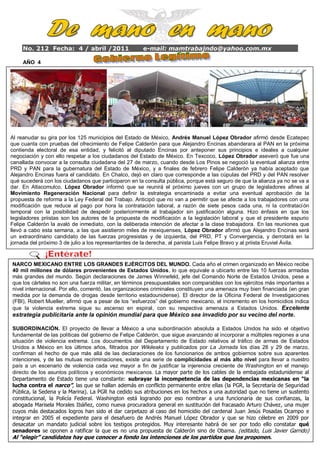 El documento resume las declaraciones de Andrés Manuel López Obrador durante su gira por el Estado de México. López Obrador afirmó tener pruebas de que Felipe Calderón ofreció al PAN que Alejandro Encinas fuera su candidato en el Estado de México. Encinas rechazó esta oferta y mantuvo su lealtad a sus principios. López Obrador también criticó la propuesta de reforma laboral del gobierno que perjudicaría a los trabajadores. Predijo que Encinas ganaría la gubernatura del Estado de México para las