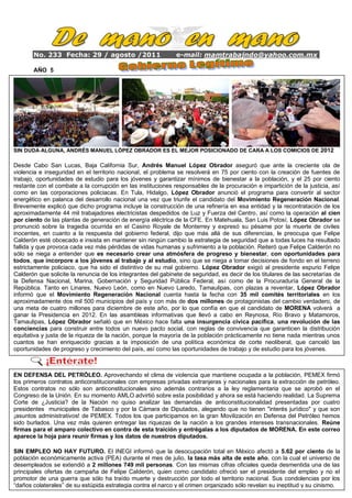 El documento resume las actividades recientes de Andrés Manuel López Obrador. Señala que AMLO sigue siendo el mejor posicionado para las elecciones de 2012 y que ha realizado eventos en varios estados donde habla sobre temas como seguridad, energía y desarrollo nacional. También critica al gobierno de Felipe Calderón por su estrategia fallida de seguridad y por permitir contratos de petróleo anticonstitucionales con empresas privadas.