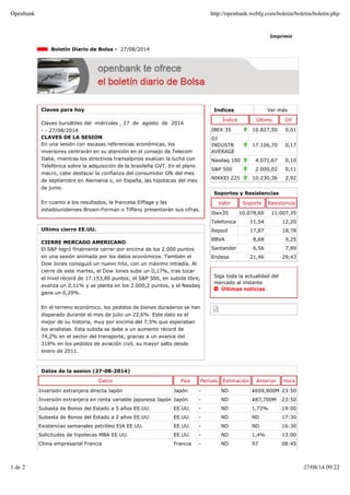 El documento resume las claves de la sesión bursátil del día, incluyendo los índices de mercado, los datos económicos relevantes como las hipotecas en España y la confianza del consumidor en Alemania, y los resultados esperados de varias compañías. También analiza el cierre del mercado estadounidense, con alzas en el Dow Jones, S&P 500 y Nasdaq, impulsados por datos positivos de pedidos de bienes duraderos. Por último, proporciona soportes y resistencias de varias empresas españolas.