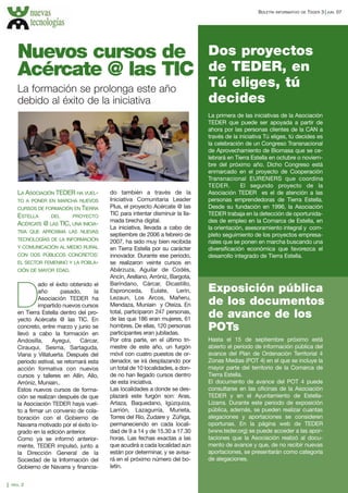 La Asociación TEDER ha renovado su página web www.teder.org para ofrecer información más completa y accesible. La página incluye secciones sobre la asociación, proyectos de ayuda, noticias actualizadas, documentos y enlaces de interés para la región de Tierra Estella. Además, TEDER ha lanzado nuevos cursos de formación en TIC como parte de su proyecto Acércate @ las TIC para reducir la brecha digital en las zonas rurales. Finalmente, se ha completado la iluminación