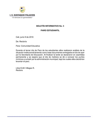 El boletín informa que los estudiantes realizaron análisis de la situación institucional durante el tercer día del paro estudiantil basados en documentos entregados por la Secretaría de Educación, y que se declararon en asamblea permanente esperando dar a conocer el día siguiente los puntos mínimos que la administración municipal debe cumplir para que levanten el paro.