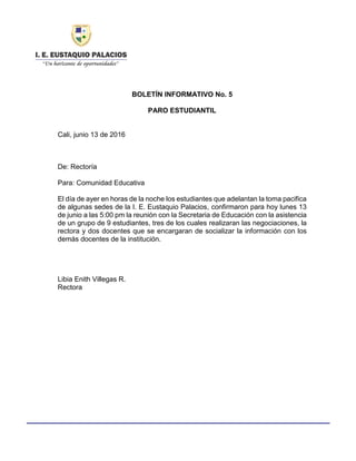 La rectora de la I. E. Eustaquio Palacios envió un boletín informativo a la comunidad educativa anunciando que los estudiantes que llevan a cabo una toma pacífica de algunas sedes de la institución confirmaron una reunión con la Secretaría de Educación para ese día a las 5:00 pm, en la que tres estudiantes negociarían y la rectora y dos docentes socializarían la información con el resto de docentes.
