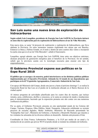 La provincia de San Luis iniciará la exploración de hidrocarburos en un nuevo área al sur de Villa Mercedes, sumando una cuarta zona a las tres que ya explora en el norte. El gobierno provincial expone sus políticas en la Exposición Rural 2010 a través de stands de diferentes ministerios. Comenzó la construcción de una nueva cárcel modelo en Pampa de las Salinas.