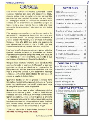 Este documento es el número 21 del año 2008 de la revista "Palabra Juniorista" del colegio Camara Junior en Armenia, Quindío. Contiene varios artículos sobre temas educativos, culturales y de actualidad. El rector Anselmo Collazos hace un llamado a proteger la educación pública ante los recortes presupuestales y propone mayor conciencia ciudadana sobre este tema.