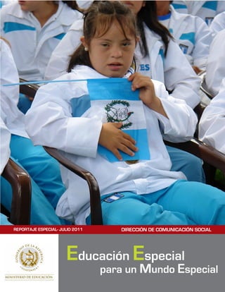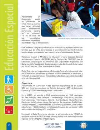 Este documento describe los esfuerzos del Ministerio de Educación de Guatemala para brindar educación especial a niños con discapacidades o necesidades educativas especiales. Explica que actualmente se atiende a más de 15,000 estudiantes en todo el país a través de escuelas inclusivas y de educación especial. También destaca varios proyectos de cooperación internacional que apoyan la educación especial en Guatemala.