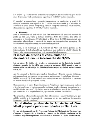 El documento describe la construcción del complejo Terrazas del Portezuelo en San Luis, que consiste en una pirámide central y módulos ministeriales. Incluye detalles sobre el diseño de los edificios, los avances de la obra y su importancia para la provincia.