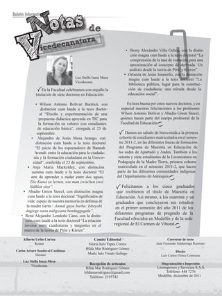El boletín informativo de la facultad de educación resalta la graduación de siete nuevos doctores en educación y el compromiso académico de la facultad para avanzar en la educación superior en Colombia. Destaca la creación de nuevas maestrías y programas, así como la apertura de un centro de documentación que facilita el acceso a recursos educativos. Además, se enfatiza en la importancia de la internacionalización y el fortalecimiento de redes de investigación en educación.