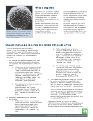 El documento describe las distintas etapas del desarrollo humano desde la fertilización. Señala que la vida humana comienza con la unión del óvulo y el espermatozoide, dando inicio a un proceso de desarrollo continuo e interdependiente de un nuevo ser humano. Explica que cada etapa se encuentra genéticamente determinada y depende de la anterior, por lo que el desarrollo no puede ser discontinuo.