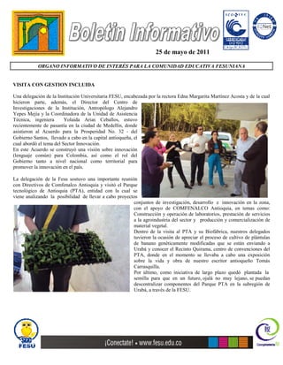El documento resume la visita reciente de una delegación de la Universidad FESU a Medellín para asistir a una reunión sobre innovación y visitar el Parque Tecnológico de Antioquia. También menciona la segunda etapa del proyecto Apartadó Bilingüe de la Universidad FESU y Municipio de Apartadó, y los planes para celebrar el 10o aniversario de la Universidad FESU.