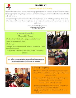 Este boletín describe una experiencia educativa alternativa llamada Escuela de Segunda Oportunidad que promueve un modelo de educación más democrático y dialogante anclado en los saberes locales. La experiencia ofrece talleres y clases en Castro y la isla de Lemuy para validar los saberes populares y académicos. También describe las reuniones regulares del equipo para planificar y evaluar la experiencia educativa.