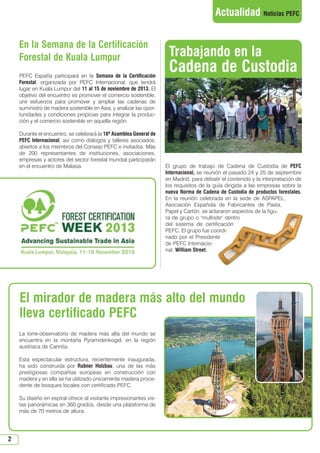 El documento resume varias noticias relacionadas con la certificación forestal sostenible PEFC, incluyendo: 1) La participación de PEFC España en la Semana de la Certificación Forestal en Kuala Lumpur; 2) Un homenaje a Francisco Rovira, expresidente de PEFC España; y 3) Un evento en CaixaForum sobre economía, sostenibilidad y bosques con la participación de representantes del Ayuntamiento de Madrid, Forética, Knauf y SEUR.