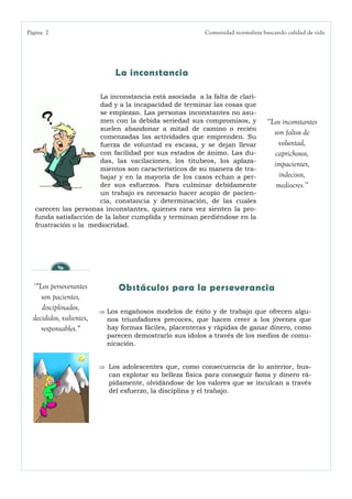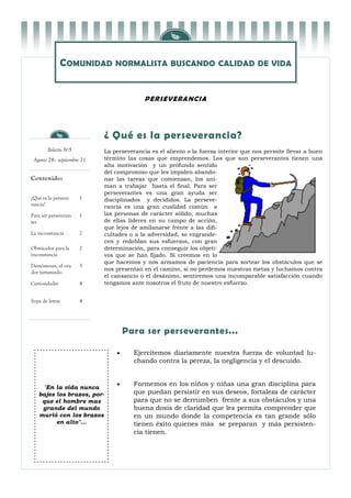 Este documento habla sobre la importancia de la perseverancia. Explica que la perseverancia es la fuerza interior que nos permite completar las cosas que emprendemos a pesar de los obstáculos. También discute que las personas perseverantes son motivadas, comprometidas y no abandonan fácilmente sus metas. Finalmente, da ejemplos de personas como Demóstenes que tuvieron éxito a través de su perseverancia a pesar de enfrentar dificultades iniciales.
