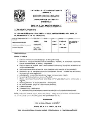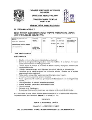 El documento anuncia dos plazas vacantes interinas para impartir la asignatura de Morfofisiología de segundo año en la Facultad de Estudios Superiores de Zaragoza. Se describen los módulos, días, horarios y vigencia de las plazas. Los solicitantes deben cumplir con ciertos requisitos como titulación universitaria y experiencia docente, y enviar su solicitud antes del 13 de febrero de 2014.