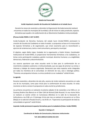 La organización no gubernamental Incide-Fundación de Derechos Humanos del estado Sucre promoverá la creación de Escuelas de Ciudadanía en todo el estado durante noviembre y diciembre. Estas escuelas proporcionarán herramientas formativas a los ciudadanos en temas como participación ciudadana, gestión municipal, derechos humanos y democracia. Incide realizará encuentros en cada municipio para dar a conocer la propuesta y conformar las escuelas, con el objetivo de formar un movimiento ciudadano autónomo e instituc