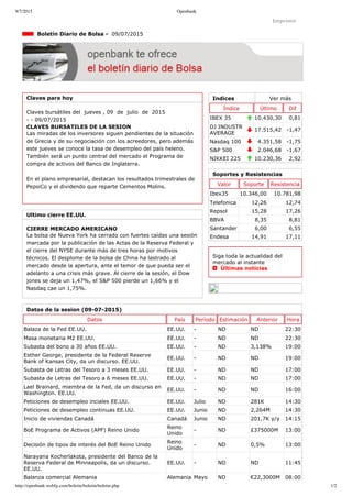 El documento resume las claves bursátiles del día, incluyendo la situación de Grecia y los resultados empresariales esperados. También analiza el cierre del mercado estadounidense del día anterior, marcado por fuertes caídas. Por último, proporciona los datos macroeconómicos y empresariales más relevantes del día, así como los niveles de soporte y resistencia de varios valores.