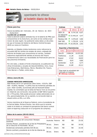 El documento resume las claves bursátiles del día, incluyendo la atención a los datos económicos de la zona euro y Estados Unidos, así como los resultados trimestrales de varias empresas. Se espera que los índices bursátiles se centren en los informes de actividad del sector servicios y las ventas minoristas en la zona euro, y los datos de empleo en Estados Unidos.
