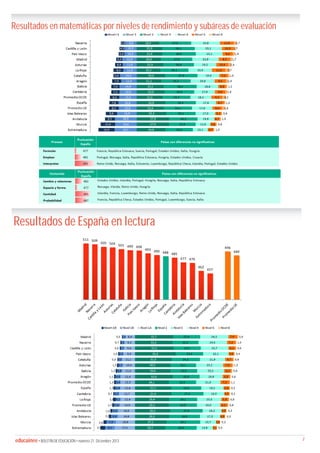 El documento presenta los resultados de España en la prueba PISA 2012, la cual evalúa las habilidades en matemáticas, lectura y ciencias de estudiantes de 15 años. España obtuvo puntajes por encima del promedio de la OCDE en matemáticas y ciencias. Factores como el sexo, repetición de cursos y condición de inmigrante están asociados con los resultados.