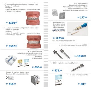 Este documento presenta una lista de precios de diferentes kits y productos odontológicos, incluyendo kits de mini implantes, brackets, arcos, alambres, limas, gutapercha y otros suministros para ortodoncia y endodoncia. Se proporcionan detalles como contenido, precios y ofertas para cada producto.