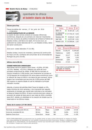 El documento resume las claves bursátiles para la sesión del viernes 17 de junio de 2016, destacando que habrá pocos datos económicos tras las reuniones de la Fed y el Banco de Japón esta semana. Se publicarán datos de costes laborales en la eurozona y del sector constructor en EEUU. Wall Street cerró al alza, deteniendo 5 días de caídas, aunque el petróleo bajó un 4% y los inversores analizan las previsiones revisadas a la baja de la Fed para 2016-2017.