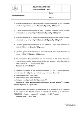 Este boletín de ejercicios contiene 8 problemas sobre cálculos de densidad, volumen y presión de sustancias como hielo, alcohol y aceite. Los estudiantes deben calcular valores como la densidad de cuerpos dados su masa y volumen, la masa de una sustancia que cabe en un recipiente, el volumen de un cubito de hielo, y la presión ejercida sobre un gas en un recipiente.
