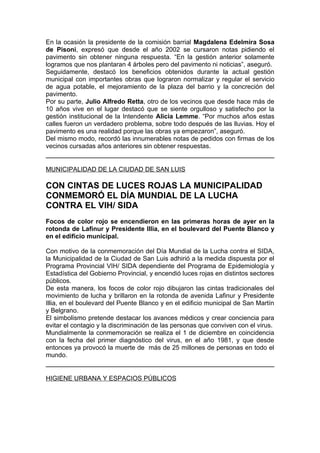 Funcionarios municipales anunciaron la pavimentación de 47 cuadras en el barrio Cerro de la Cruz. La Municipalidad también conmemoró el Día Mundial de la Lucha contra el SIDA iluminando edificios de color rojo y realizó operativos de limpieza en los barrios 1o de Mayo y Eva Perón. Asimismo, lleva a cabo campañas de prevención contra el dengue en los cementerios municipales.